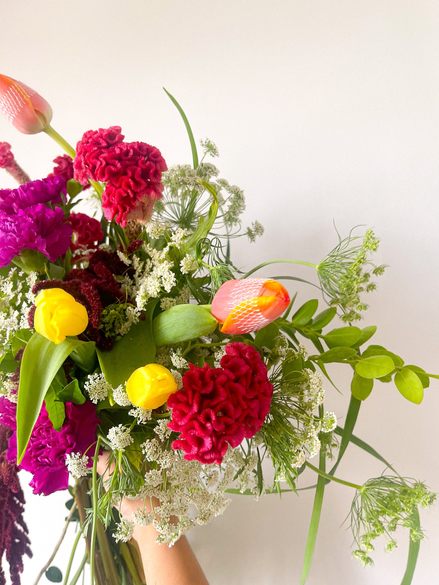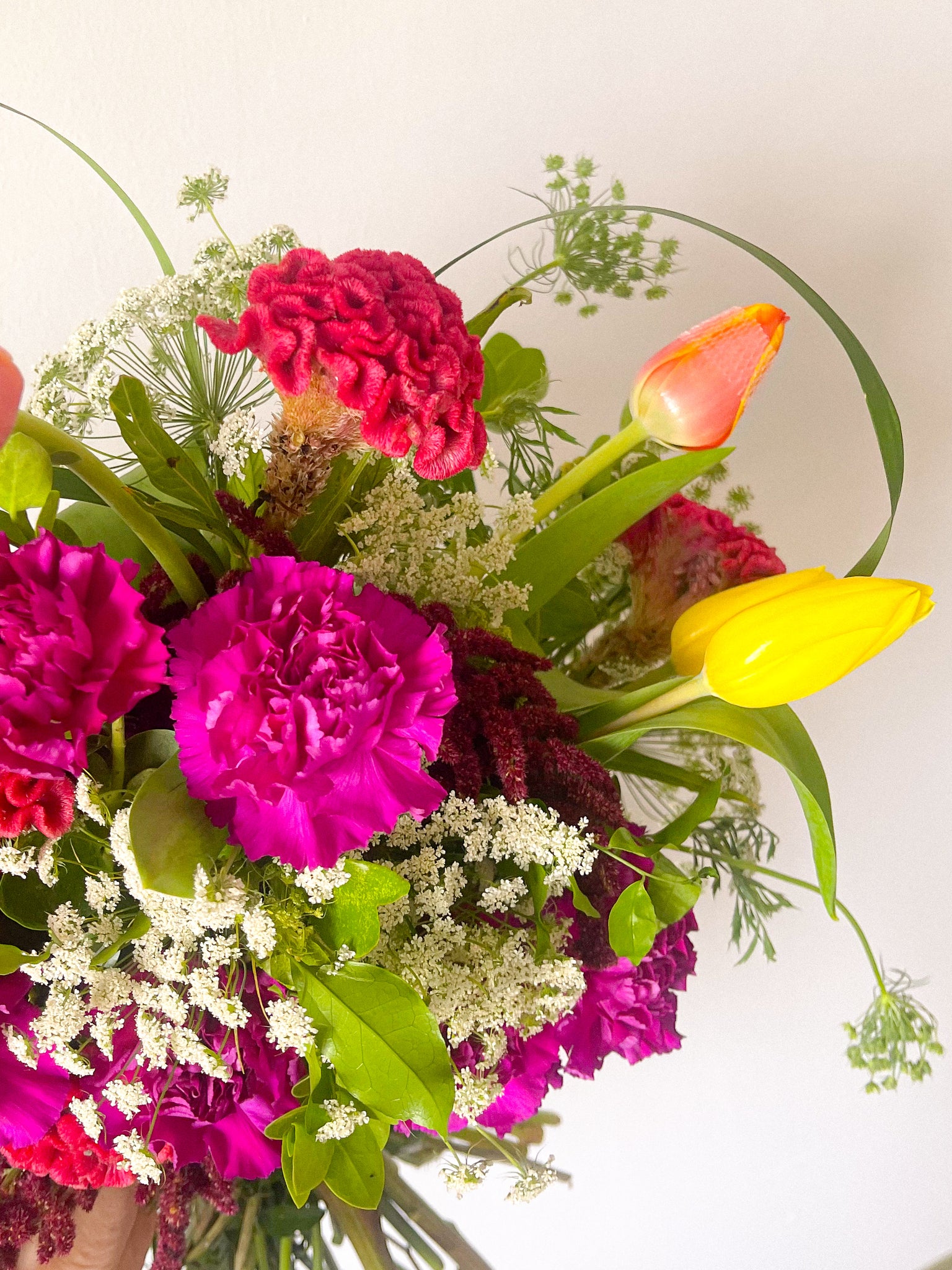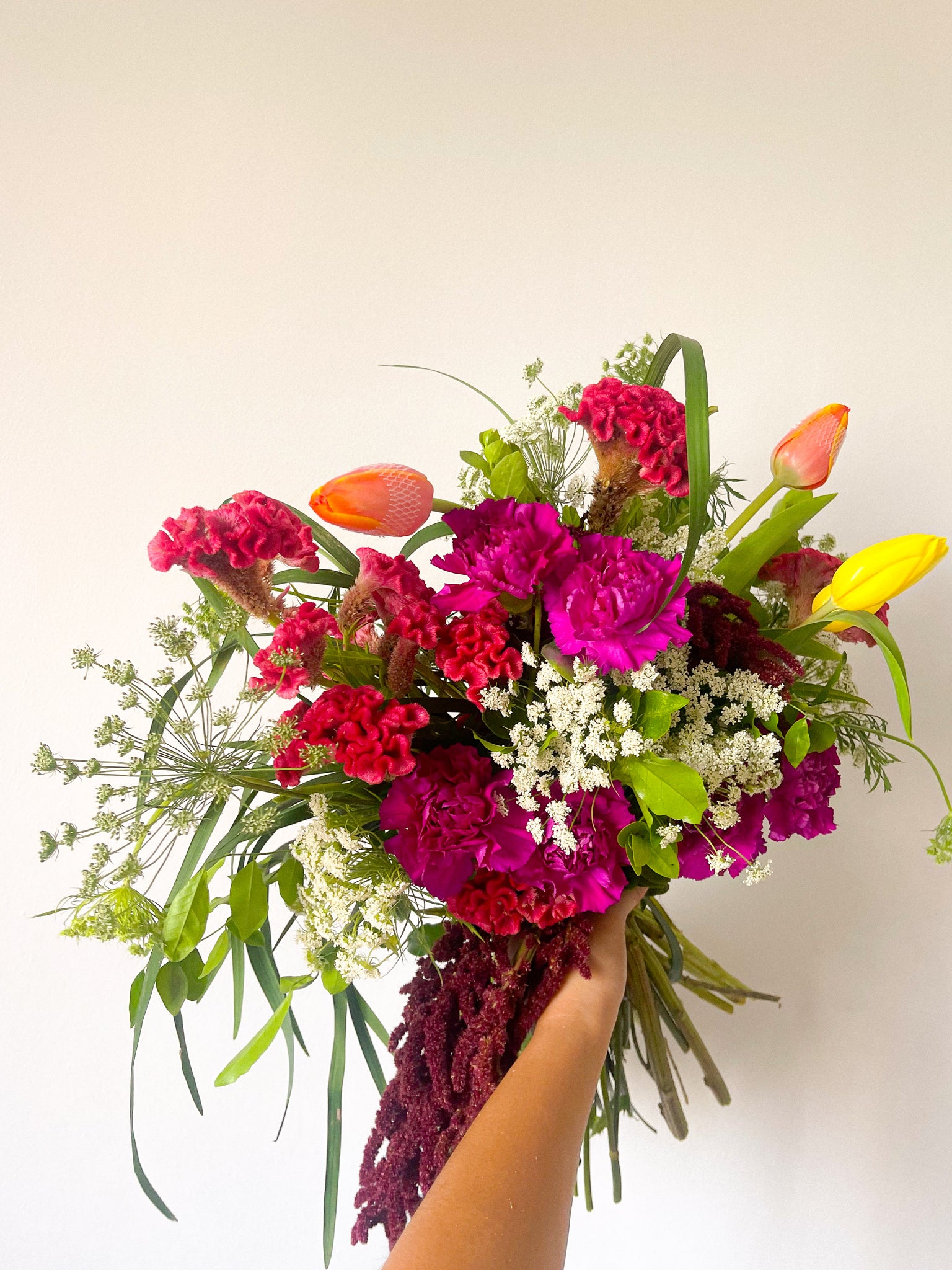 This wildflower bouquet is composed of Carnations and Tulips as focal flowers, while Queen Anne and Amaranthus serves as its main fillers.
